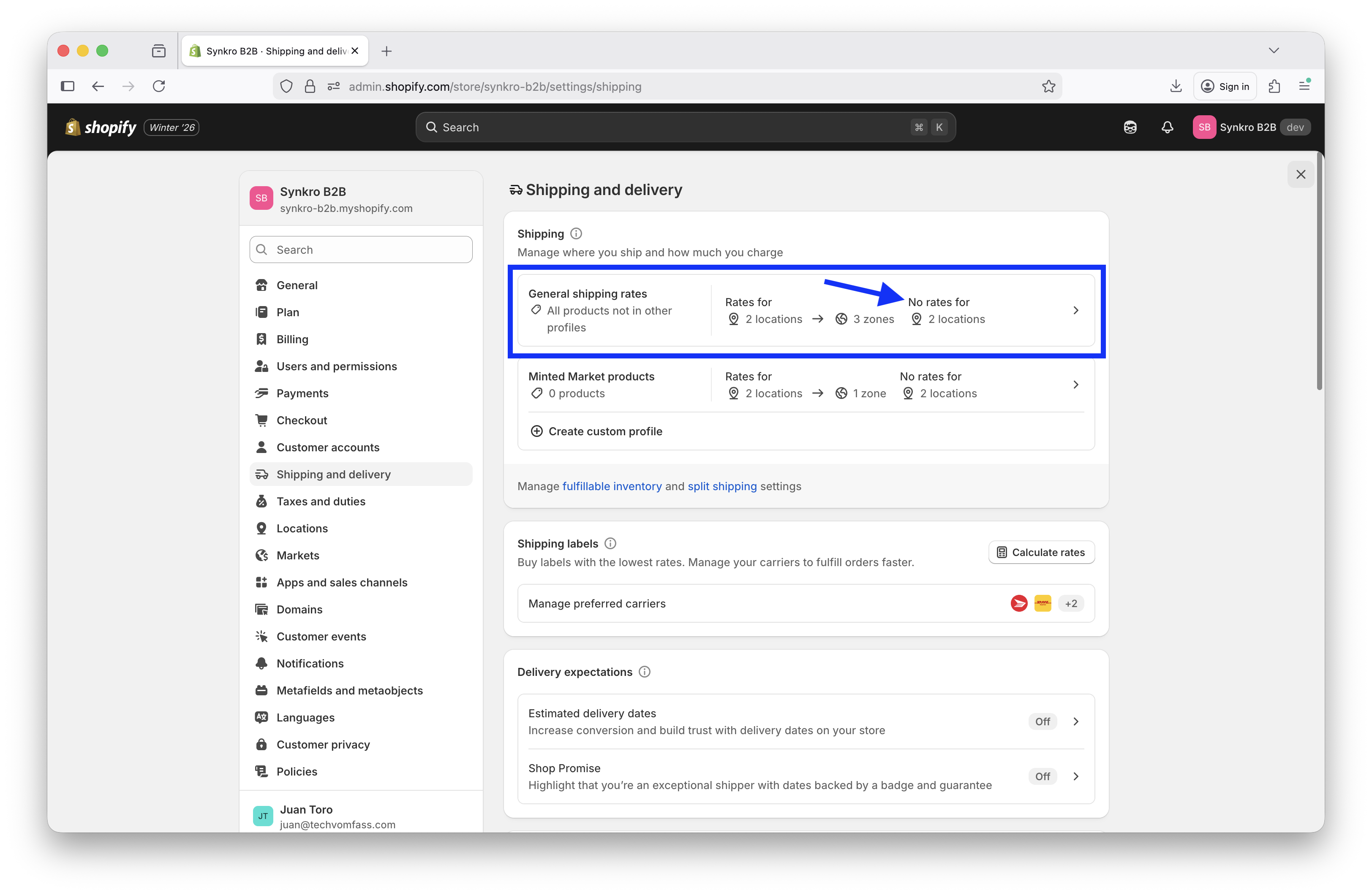 Open shipping rates section within "Shipping and delivery" settings