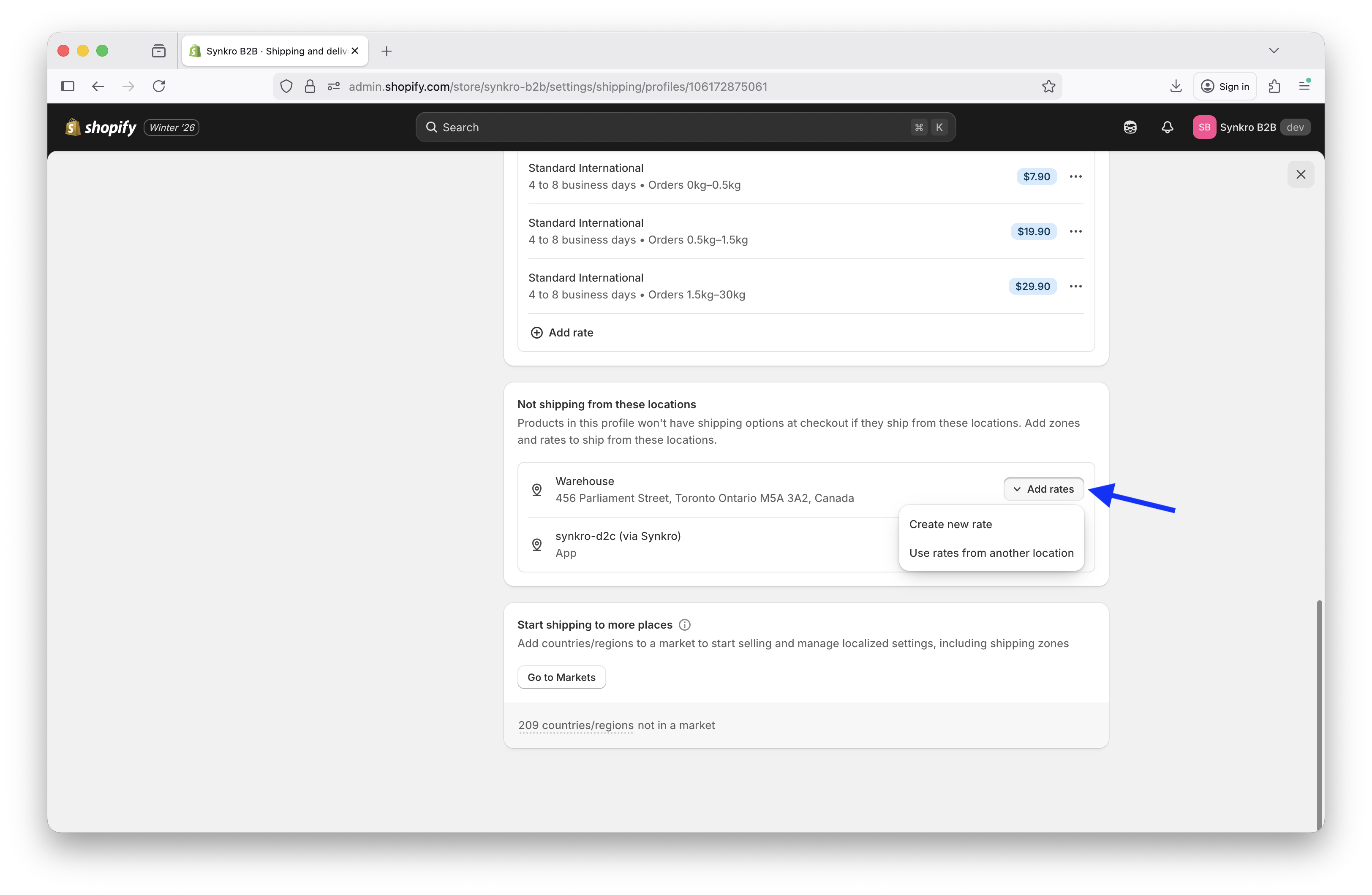 Scroll through the sections of the Shipping Profile page and find the heading labeled "Not shipping from this location". Find the Synkro-powered location, which will be labelled similar to "supplier-store (via Synkro)". Beside that location, click "Add rates".
